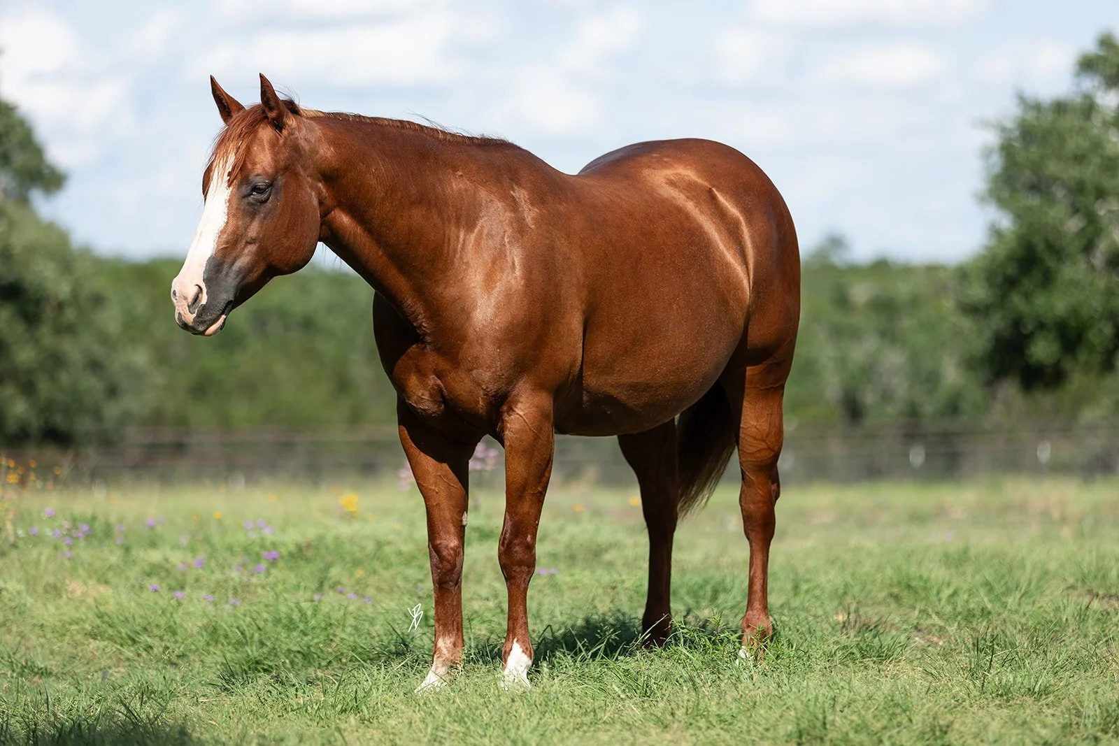 2012 sorrel mare, sired by Smart Chic Olena out of the mare Diamond Shine Rock (Shining Spark). This young daughter of Smart Chic Olena has NRHA earnings and a grand-dam (Lucky and Flashy) who produced earners of over $95,000. Her first foal was born in 2017 and is money earner; her last foal was born in 2024, a filly by Gunners Special Nite.